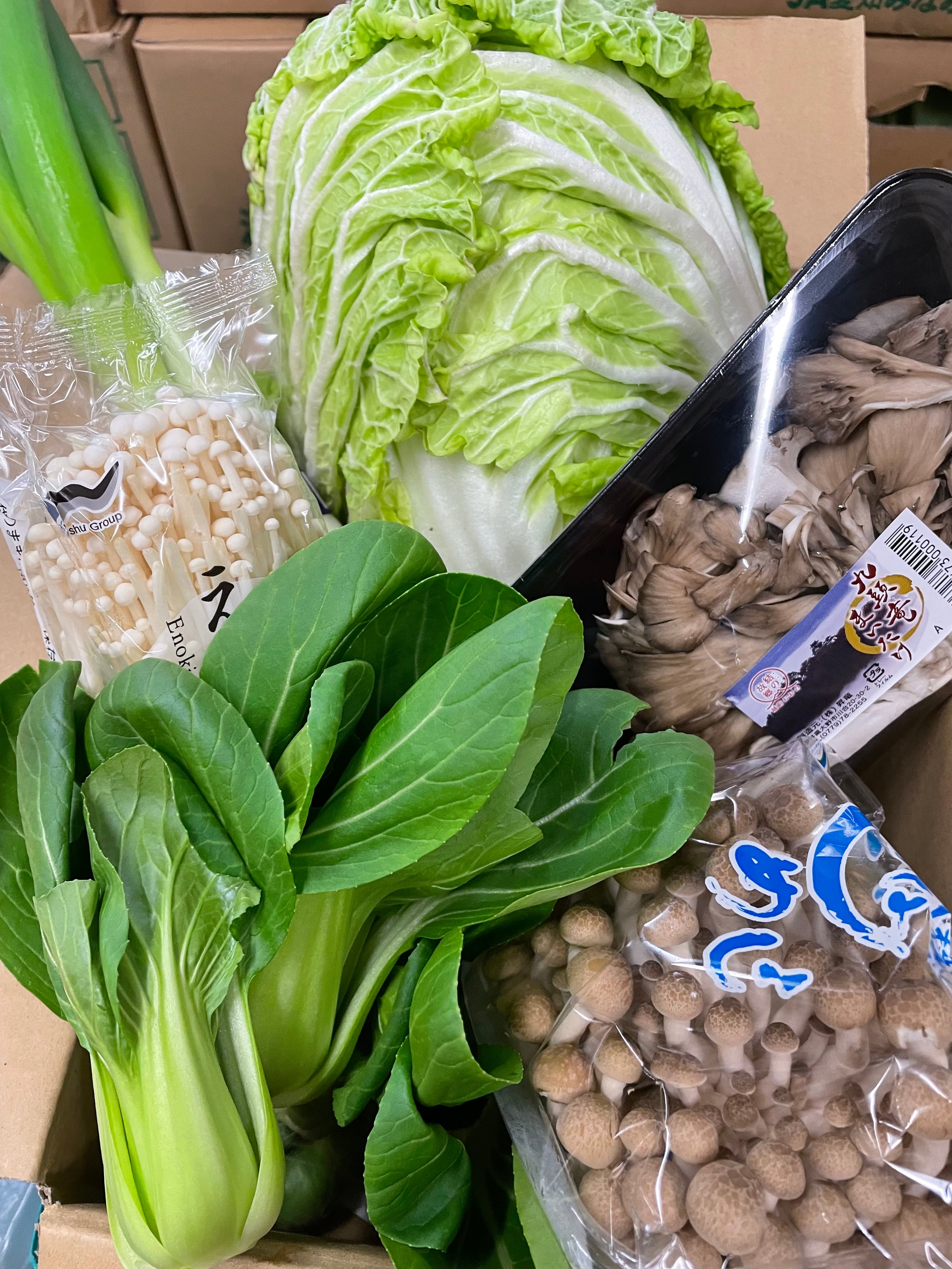 お鍋に欠かせない白菜、ねぎ、きのこ類などを詰め合わせたセットです。 野菜 3~4種類 きのこ類 3~4種類 まだまだ寒い日が続くこの季節、みんなで鍋パーティーはいかがですか?